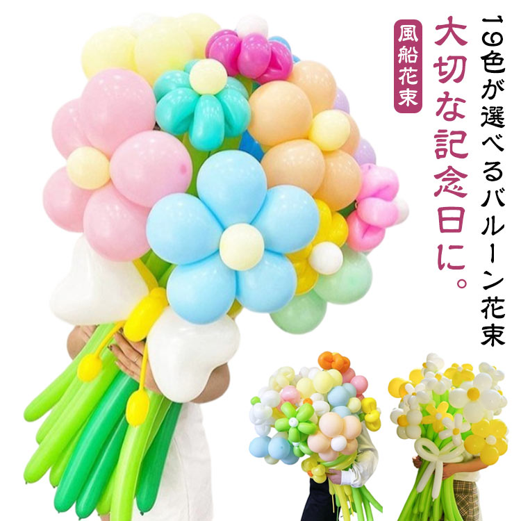 このバルーン花束は、19色の豊富なカラーバリエーションから選べるため、誕生日や卒業・卒園、母の日などのお祝い事はもちろん、好きな色を組み合わせる推し活にも最適です。花束の代わりとして華やかさを演出し、謝恩会や入園祝いといった幅広いシーンで喜ばれるデザインでありながら、風船ならではの軽やかさと可愛らしさを兼ね備えた、特別な日のギフトにぴったりなアイテムです。文字数: 182文字