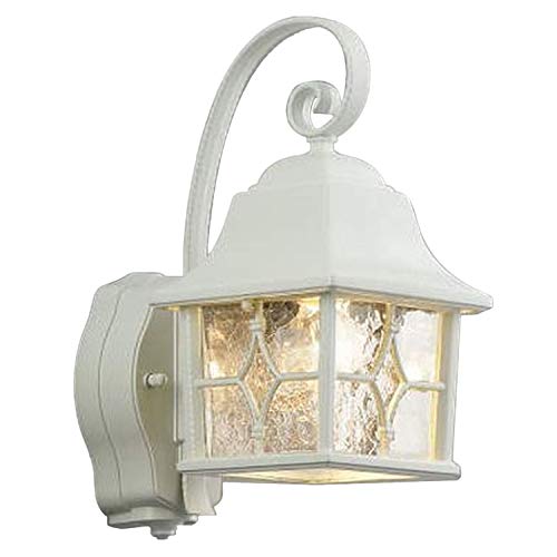 こちらコイズミ照明のポーチライトはどうでしょう。ホワイトカラーでアンティーク調のデザイン、透明ひび焼きのガラス仕様で、お洒落に可愛くまとまっています。マルチタイプの人感センサ付きなのと、LEDランプ仕様で使い勝手が良くお薦めです。