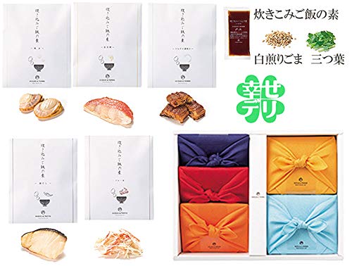 日高産昆布や焼津産鰹など厳選素材で化学調味料を使用していない、ひとつひとつ丁寧にカラフルな風呂敷で包まれた炊き込みご飯の素です。
