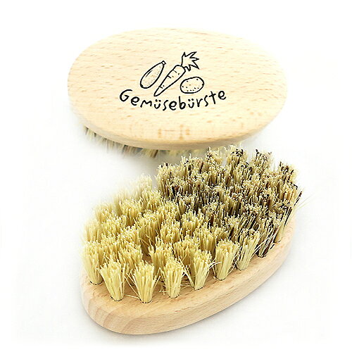 REDECKER社へ別注したベジタブルブラシがおすすめです。ハード(茶色)とミディアム(クリーム色)の2種類のブラシ毛が植込まれています。耐水性を高める為に、ボディはオイルコーティングされています。野菜の泥落とし、皮の柔らかいお野菜などは、皮もキレイに剥けます。小さな野菜にも使いやすい、コンパクトサイズです。