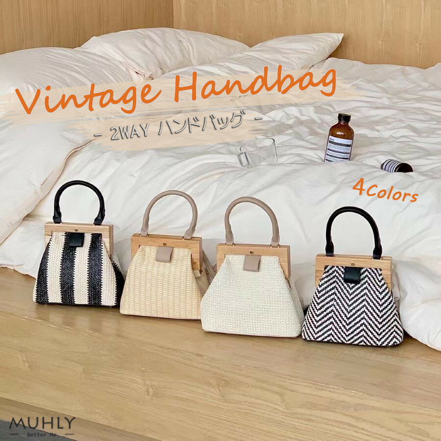 ラタンと木を組み合わせたちょっと変わったデザインのバッグ。無地ですが色使いが個性的なものもあり、これを持つだけでおしゃれさがワンランクアップしますね。