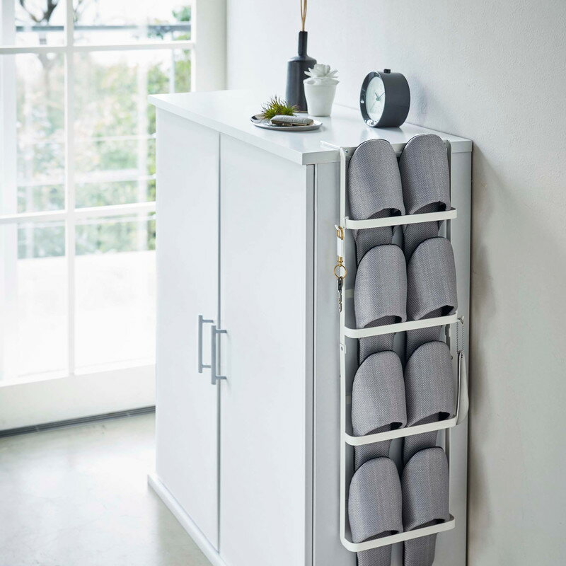 下駄箱に引っかけて使うスリッパラックです。スリムで置き型ではないので、場所を取らず省スペースです。引っかけ式だとお掃除がラクな所も嬉しいですね。