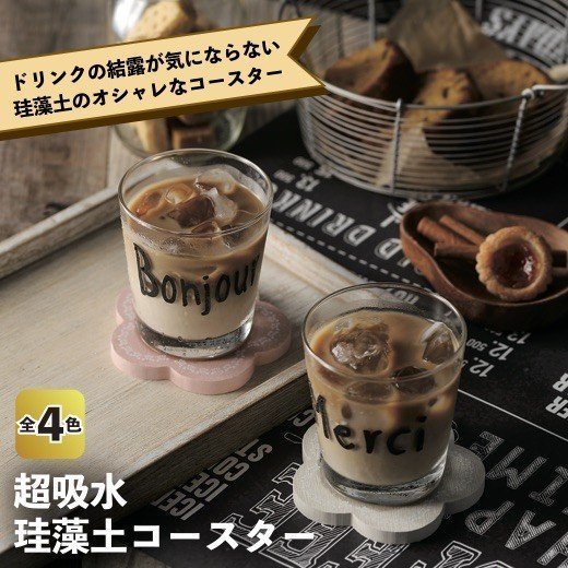 お花の形が可愛い珪藻土のコースターです。すぐに水分を吸収してくれるので冷えたドリンク等を飲むときに良いですね!2個セットです。