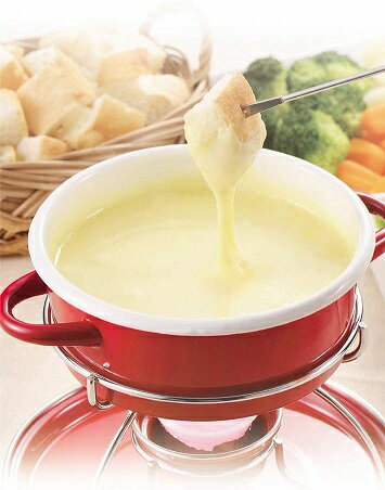 ホーローのチーズフォンデュ鍋セットはいかがでしょうか。IHにもガス火にも対応の鍋なので、ある程度キッチンのコンロで温めて、テーブルでは付属のスタンド類にのせてフォンデュが楽しめます。温めには固形燃料を使って、炎の優しい揺らぎを見ながらお食事ができます。