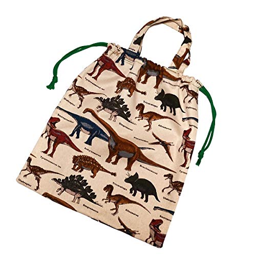 レイラバッグストアの巾着スタイルの大き目の体操着入れ袋です。子供の人気な恐竜がたくさんデザインされています。生地は恐竜とベースはベージュで落ち着いた感じ更に持ち手付きの巾着で運び易いです。
