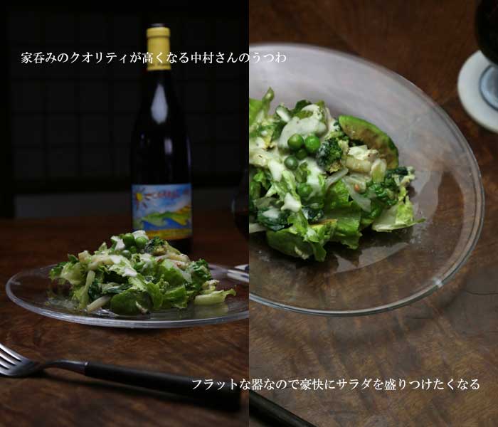 ガラス作家さんの手によるガラスの器です。楕円形の形で、お皿の中に気泡でデザインが施されておりとても素敵です。ガラスの大きめのお皿は、夏に冷たいメインのお料理や、サラダ、冷製パスタなど、意外に使い勝手がよくておすすめです。
