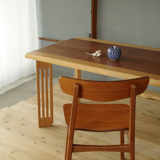 ウォルナットとタモが使われ、2色のコントラストが美しいこちらのダイニングテーブルは、アーテスティックな脚も特徴的で和モダンなおしゃれさがありますよ。