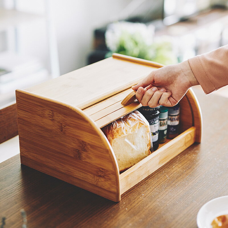 こちらのブレッドケースはいかがでしょうか?パンはもちろん、調味料の保存もできるブレッドケースです。蛇腹式の扉で開け閉めしやすいこと、竹素材で調湿性があること、手頃な大きさがおすすめポイントです。