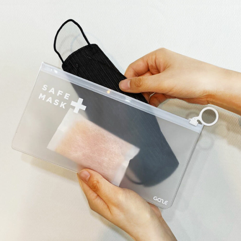ストックのマスクを会社に置いておく用途なら、持ち出し禁止のものは入れていませんよということをアピールする必要があるかもしれません。その場合、中が見えるフラットポーチが使いやすいと思います。こちらはそういう用途でも使えるし、一時的に外しておくマスクを入れておく場合も除湿剤がついているので衛生面で安心なマスク専用ポーチです。