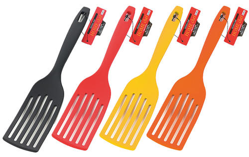 別素材のグリップ等がついていない一体成型で洗浄がしやすく、食洗器にも対応しています。また、樹脂素材なので、鍋の素材や表面加工の有無によらず傷をつけにくい点も安心です。カラフルなのがお好きならぜひ。