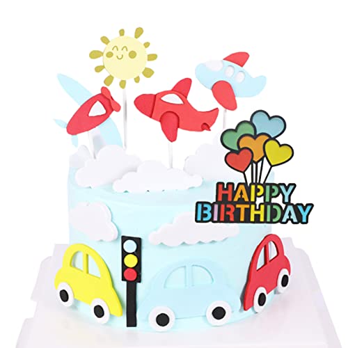 建設作業の車や飛行機や等のケーキトッパーでとても色も明るい赤色や黄色なのでとても可愛くて嬉しいかなと思いました。ハッピーバースデーの色もカラフルで風船のデザインがとてもお洒落だなと思いました。