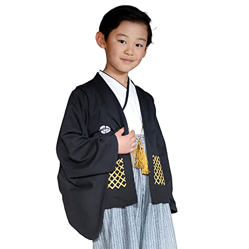 黒地に金の格子柄の羽織と、縞模様の袴がかっこいい着物の三点セットはいかがでしょうか。房付きで豪華さがありお正月にぴったりなのでおすすめします。