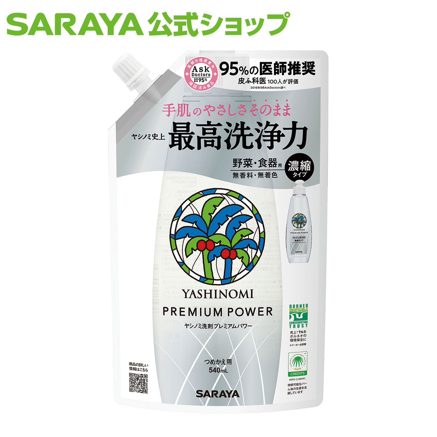 手肌に優しいサラヤのヤシノミ洗剤。ヤシノミ史上、最高洗浄力のプレミアムパワーです。油汚れに強く、泡立ちも豊かで、手肌への優しさはそのままです。皮膚科医も推奨していますよ。