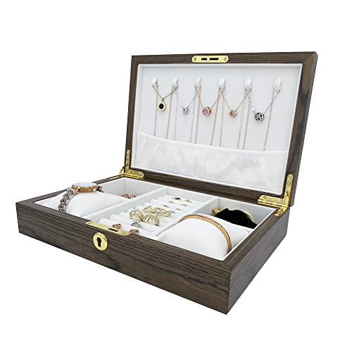 こちらはいかがでしょうか。ネックレス用のフックが6つついており、リングは18個収納可能です(リングは1列あたり2個で計算)。腕時計・ブレスレット用の枕が2つ付属しているのは珍しいかと。サイズは28×19×6センチ。どこか懐かしいゴールドカラーの鍵付です。