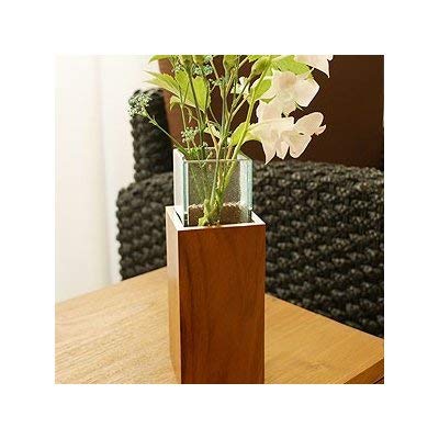 スクエア型がおしゃれなこちらのフラワーベースはいかがですか?ガラスと木製のフラワーベースが重なっていて、スタイリッシュかつ温かみのあるデザインです。