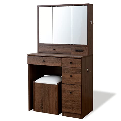 こちらはいかがでしょうか。左右の鏡が大きい三面鏡なので、横顔や後ろ姿の確認が容易です。鏡の奥と5つの引き出しの他スツールも座面が外れて中に物が入れられて、収納力は抜群。スツールにはティッシュボックス入れがあり、まさに至れり尽くせりです。