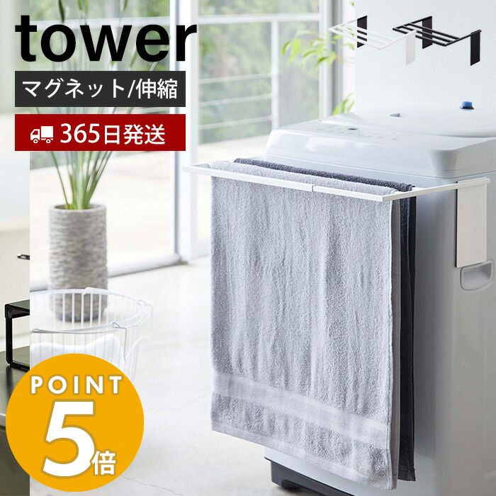 洗濯機に取り付けられるタオルハンガーをお探しでしたら、こちらはいかがでしょうか。機能性にもデザイン性にも定評のあるtowerシリーズのタオルハンガーです。伸縮式で洗濯機の幅に合わせられるので便利でおススメです。