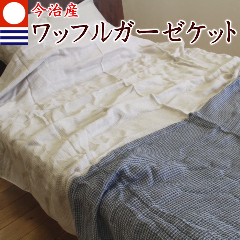 今治産のワッフルガーゼケットです。表面がさらりとした肌触りのワッフル織り、裏面がふんわりソフトな肌触りのガーゼ織りになったリバーシブルで、気温や好みに合わせて使い分けできます。