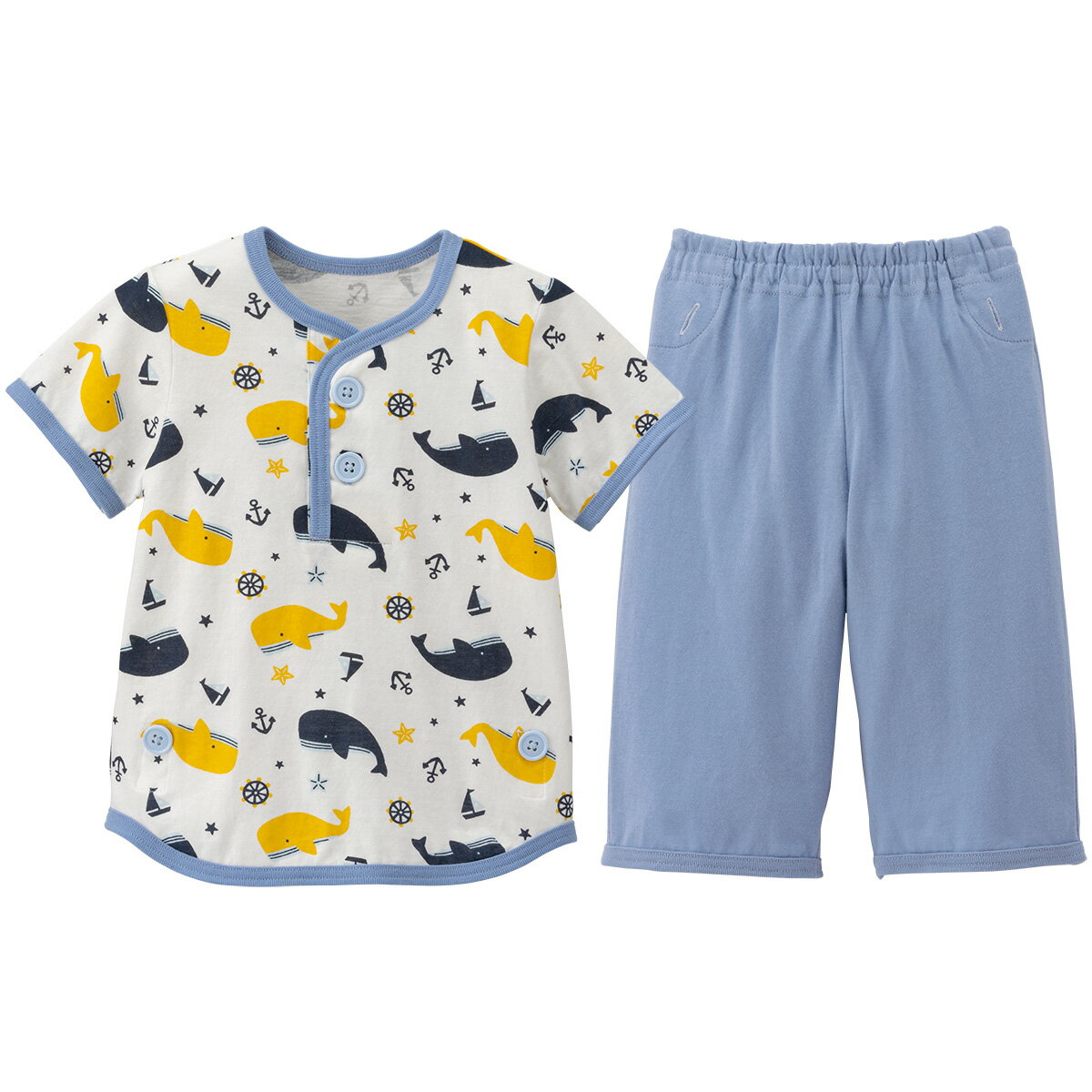 コンビミニの半袖パジャマです。紺と黄色のクジラ柄がおしゃれで可愛いですね。トップスは端が別布で処理されているなど作りが丁寧でしっかりしています。それでいて価格もリーズナブルですよ。