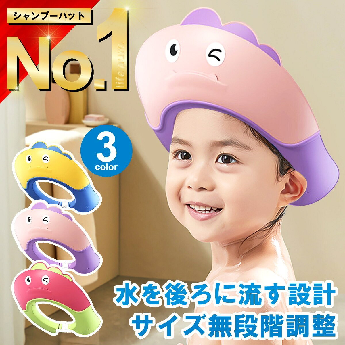 ランキングで人気の水を後ろに流す設計のキッズ用シャンプーハットは如何でしょうか。無段階のサイズ調節ができ、大きくなった時でも使えるので、オススメしたいです!