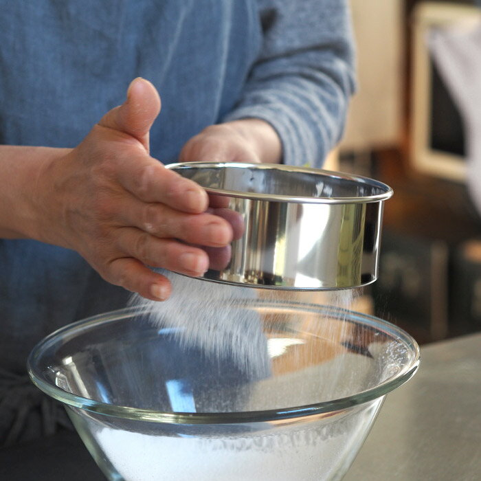 ステンレス製の粉ふるいです。面が広いので、短時間でしっかりふるえて安心ですよ。こちらは裏ごし器としても使えます。食洗機で洗えますよ。