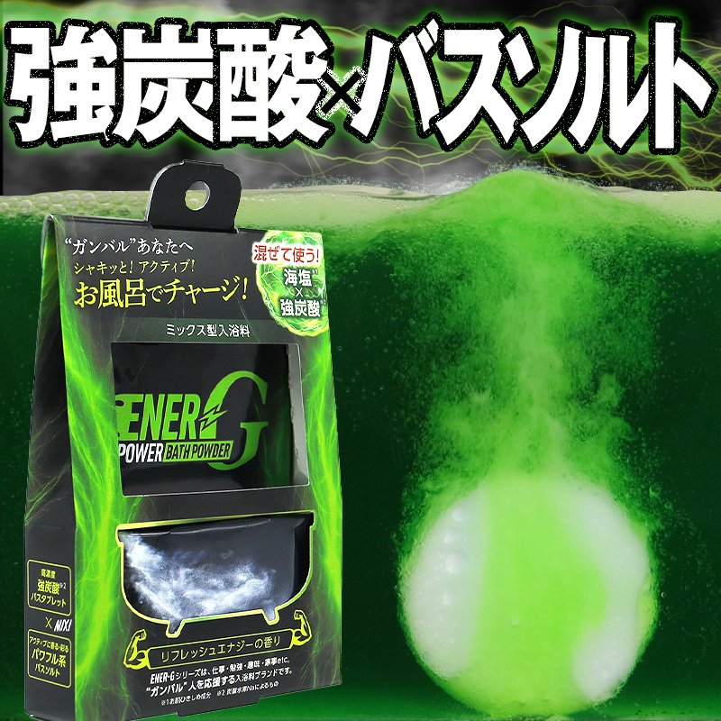 こちらの入浴剤は、混ぜて使う珍しいタイプです。天然海塩にエプソムソルトが加わり、肌をぎゅっと引き締めてくれる効果のあるエナジーバスソルトに、強炭酸タブレットを合わせることで、すかっと爽快な入浴タイムを楽しめます。浮力効果で筋肉の緊張が緩みリラックス効果も期待できます。
