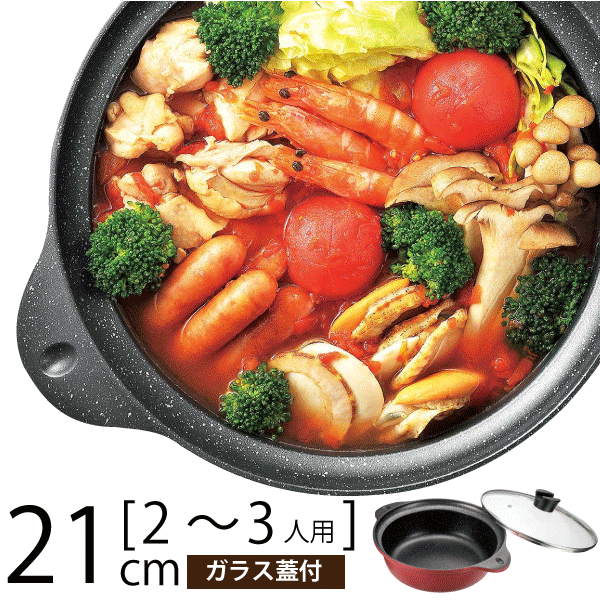 21cmなので寄せ鍋にはちょうど良いサイズ感のガラス蓋付きの両手鍋はいかがでしょうか?摩擦に強く長持ちするマーブルダイヤモンドコート加工が施されており保温力があり実用的です