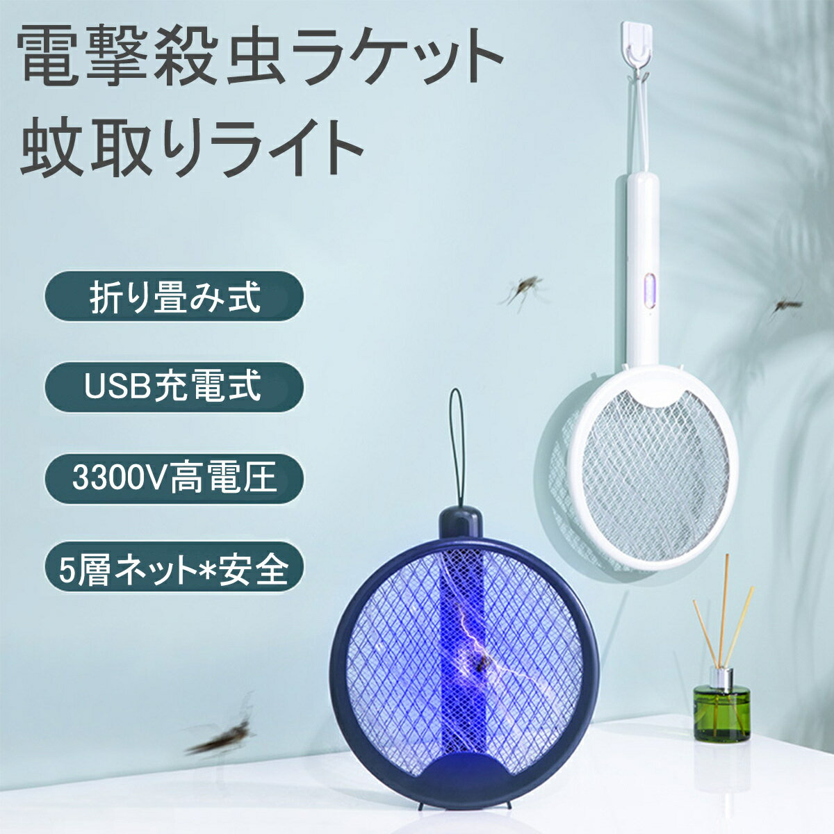 電撃殺虫ラケットにもなる殺虫ライトがおすすめです。置いたり吊り下げたりできるので、アウトドアで使いやすいと思います。USB充電式で折りたためてかさばらないので、持ち歩きやすいです。
