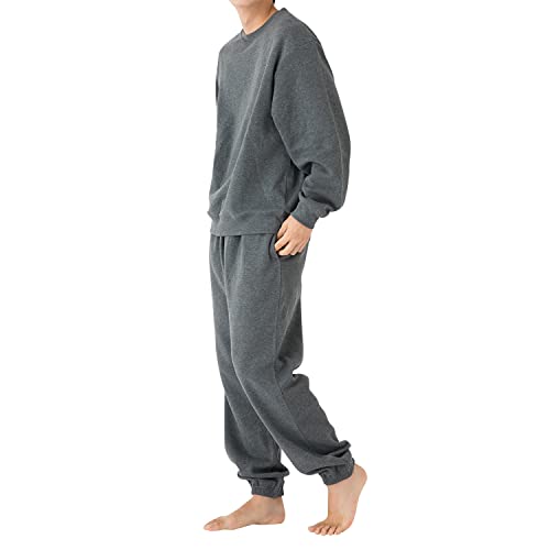 男女兼用のスウェット上下セットです。大き目のゆったりサイズで、裏起毛のため温かくリラックス時間にピッタリです。裏起毛は生地が厚手で、空気を含んで保温の効果もあるため、冬でも室内はこれ1枚で過ごすこともできます。首回りにフード等はなく、シンプルなデザインで着脱しやすく伸縮性に優れているため、つっぱり感なく動くことができます。色はライトグレーとチャコールの2色から選ぶことができます。