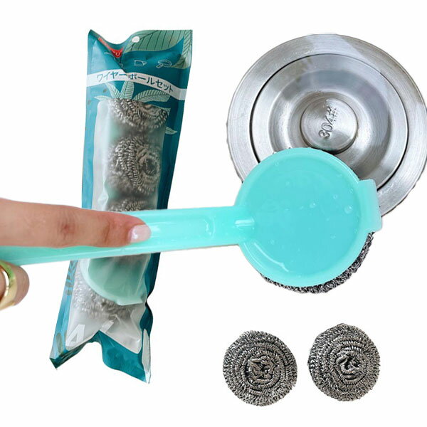 ハンドル付きの金たわし、クリーニングボールです。取っ手がついていると手が汚れないですし、とても清潔い使えるところがいいです。