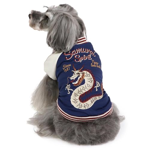 犬用のかっこいいスカジャンです。龍の刺繍入りなので、辰年にふさわしいと思います。正月の記念写真や年賀状用にぴったりだと思います。