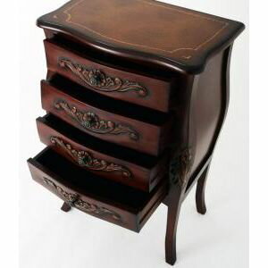 オシャレなデザインご希望とのことですのでアンティーク調で猫脚のこんな感じはいかがでしょう?重厚な天然木マホガニー製で引手なども凝っていて高級感抜群です。4段の引き出しで猫脚が付きますので高さもベッドにちょうど良いかなと思います。