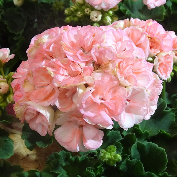 次々とお花が咲いていくので長い期間楽しめるゼラニウムの鉢植えです。八重咲の花びらが豪華で華やかな印象のロザリアという品種で、クリーム色の蕾からだんだんとピンク色に花の色が変わっていきます。
