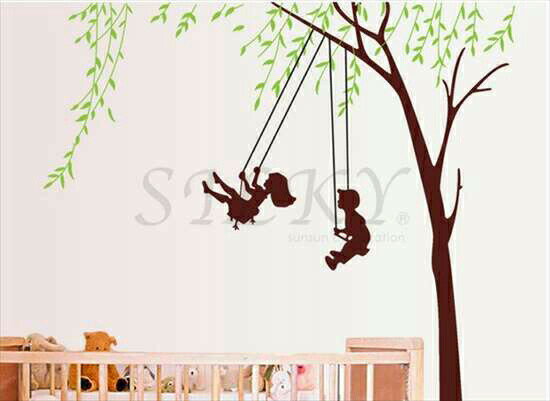 子供がブランコで遊ぶ姿が影絵みたいになっていて、モノトーンが基調の部屋の壁にマッチすると思います。ウォールステッカーなので、手軽に貼り、また剥がすことができますよ。グリーンの葉は貼ることも貼らないこともできますが、貼るとやさしい雰囲気を醸し出すので、貼った方がよいのではないでしょうか。