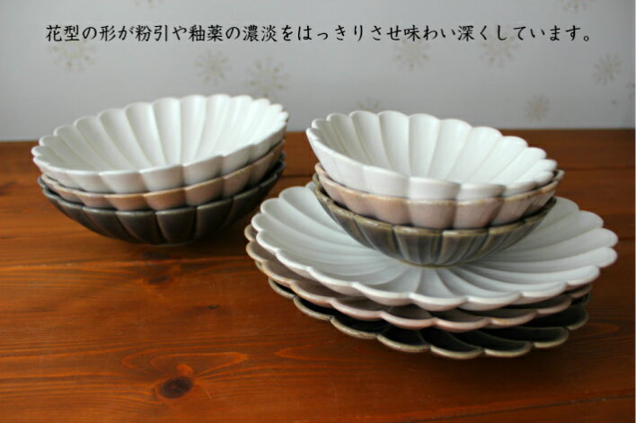 沢山の花びらが開いているようなフォルムのこの華やかなお皿はいかがですか。カラバリは三色、落ち着いた色味の効果で形の可愛らしさに加えて上品な雰囲気もあり、美しさと使い回し易さを兼ね備えているお皿なのでおススメします。綺麗な形の器に乗せるとお料理が映えて美味しく見えるので、文字通り食卓に花を咲かせられそうな、素敵なお皿だと思います。