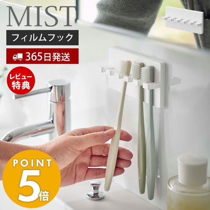 安いお値段で購入できるコスパが高い山崎実業、ミストシリーズの歯ブラシホルダーはいかがでしょう。簡単に取り付けができるフィルムフックタイプで浮かせる収納ができます。