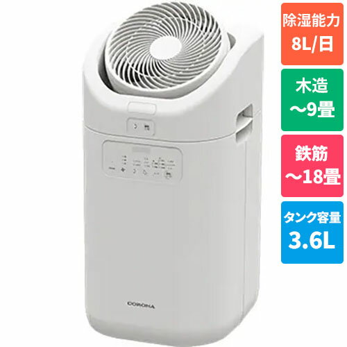 梅雨シーズンの湿気対策に、コロナのサーキュレーター連動衣類乾燥除湿機がおすすめです。タンク容量が3.6Lで部屋干しにも使えて便利です。