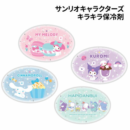 サンリオキャラクターズのキラキラ保冷剤です。マイメロ・クロミ・シナモロール・はぴだんぶいの4種類から選べます。ラメ入りのキラキラ感が女の子に喜ばれそう。