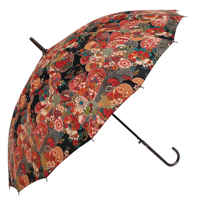 着物に似合う和柄の総柄の長傘はいかがでしょうか。16本骨で丈夫で閉じた時もスリムでお洒落です。晴れ雨兼用に使えるのでおすすめします。