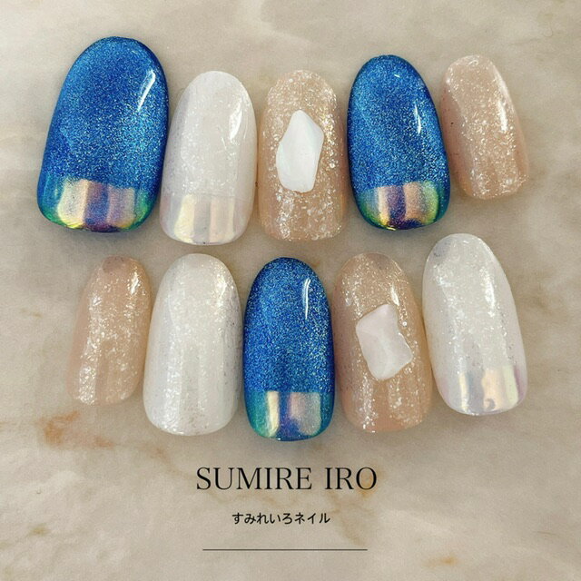 3つのカラーを使っていますが、どの指もキラキラのラメが輝いていてきれいです。青色や白色のネイルだと爪先から夏らしさを演出したいときにもおすすめです。