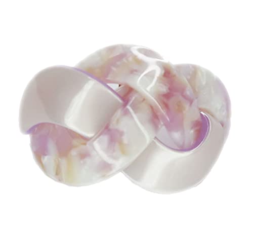 こちらはいかがでしょうか。リボンを複雑に結んだようなユニークで綺麗なデザイン。約4.9×3.2cmと程良い大きさで半円に近い形状なので、後ろ姿は勿論横から見ても決まります。カラーは4色ありますが、可愛いものでしたら写真のパープルマーブルがイチオシです。