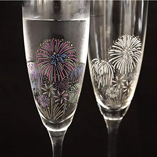 こちらのシャンパングラスは冷たい飲み物を注ぐことで変化します。グラスが17℃以下になるとまるで色とりどりの花火が打ちあがった夜空のようなデザインになります。