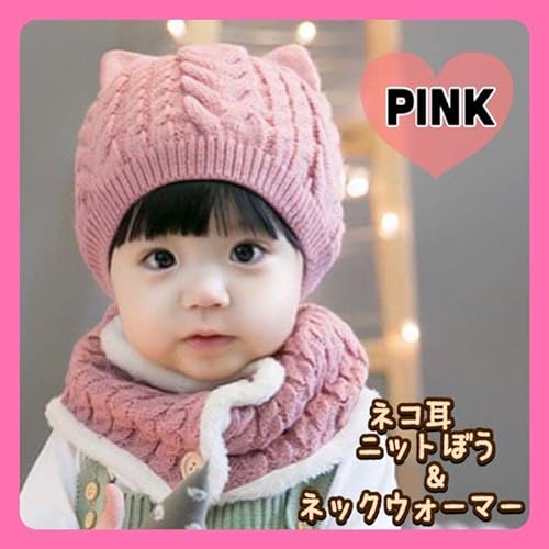 キッズ用のおしゃれなニット帽です。ピンクカラーのかわいい猫耳付き。同じピンクカラーのあたたかなネックウォーマーも付いていますよ。