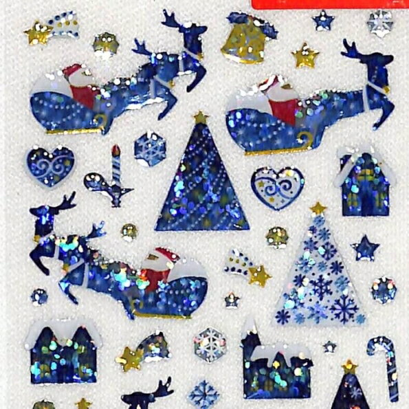 クリスマスといえば赤と緑のイメージがありますが、こちらはブルー系のデコレーションシールです。サンタさんは赤、ところどころにゴールドも入っています。ちょっと変わっているのでおすすめ。
