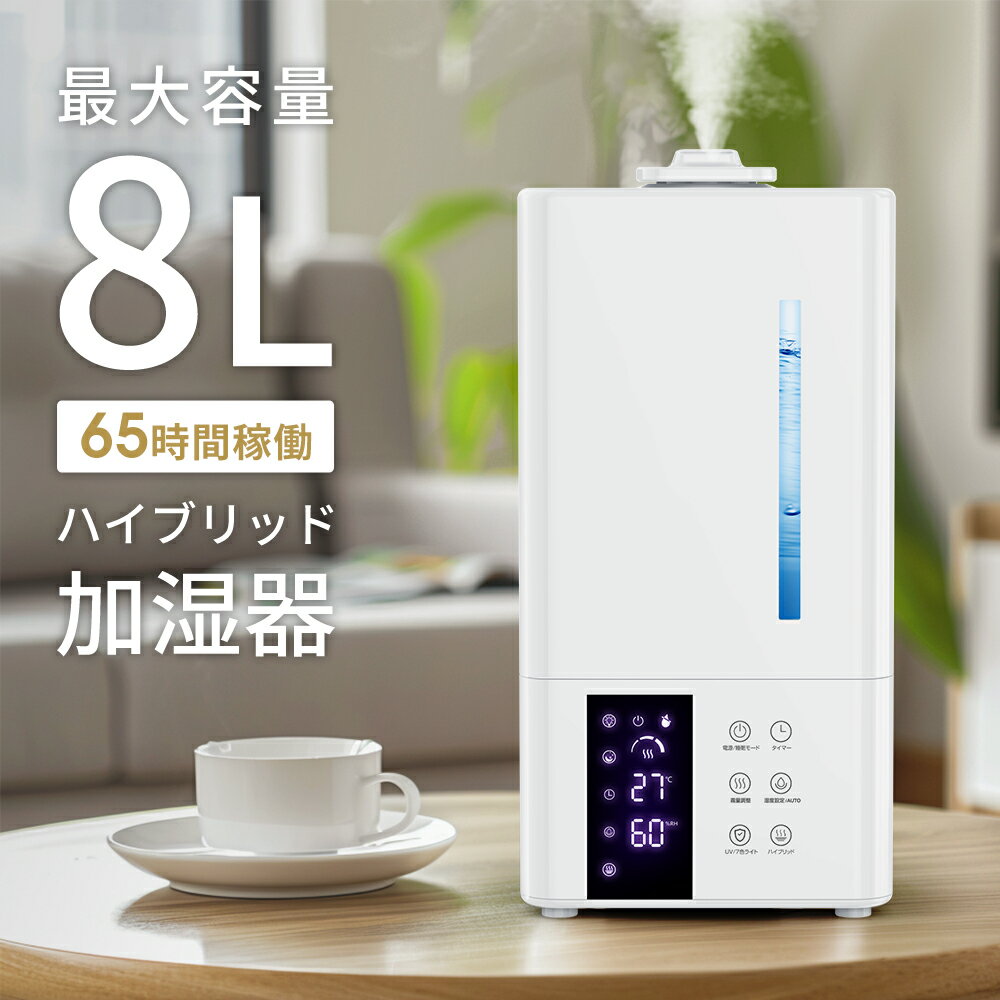 こちらの8リットルと大容量の加湿器は、ハイブリット式でUVライト除菌もできるのがいいです。熱の力でカビの発生を防ぎ、滑りにくく手入れも簡単。静音で7色ライトも搭載されているのがいいですね。