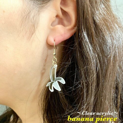 バナナのフルーツピアス・左右1セットです。シンプルでオシャレなデザインになっており、透明アクリルで耐久性のあるキュートなバナナピアスです。コスト的にも他と遜色のないものですので、良いのではないかと思います。
