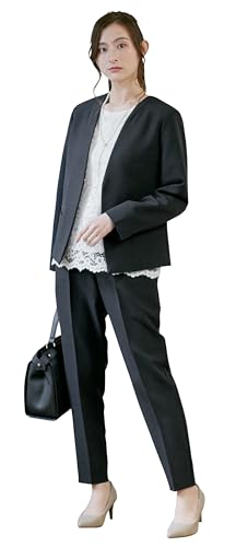 ポートエリーのレディース用パンツスーツです。Vネックジャケットとテーパードパンツ、ブラウスの3点セット。大学の入学式にぴったりですよ。