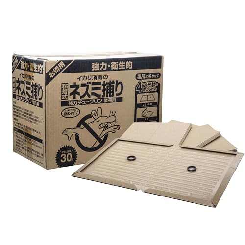 害虫駆除や消毒、衛生管理のサービスを提供するブランド、イカリ消毒の強力チュークリン業務用 粘着式ネズミ捕り30枚入りです。強力粘着剤を使用した、ネズミの捕獲率の高いシートで、通路など、ネズミの出没するところに設置することで駆除できます。ネズミに寄生する害虫等を同時に処理できるため衛生的で、毒性物質を含まないため安心して使用できます。