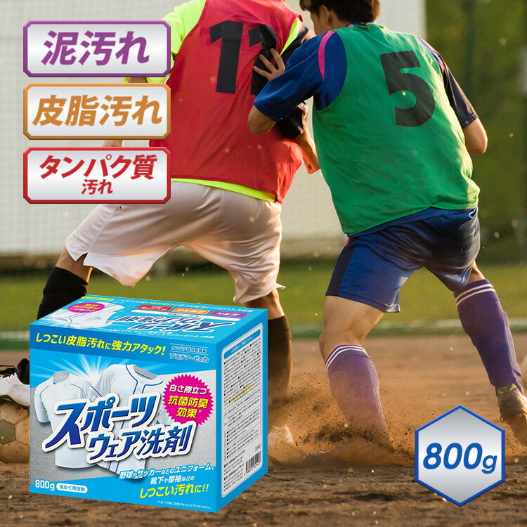 スポーツウェアについたドロ汚れや皮脂汚れもきれいに落とす強力な洗浄力をもつこちらの粉末洗剤はいかがでしょうか。無香料で抗菌防臭効果もあり衣類を白く清潔に保てます。