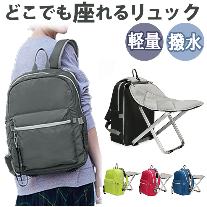 こちらの椅子が備わっている座れるリュックはいかがでしょうか?軽量で持ち運びがしやすい椅子がセットされている、A4サイズが収納できるリュックです。アウトドアで疲れたときに、いつでも直ぐに椅子に座って休憩をとることができます。撥水加工が施されていて、屋外での使用や雨の日にも安心の商品でお勧めです。